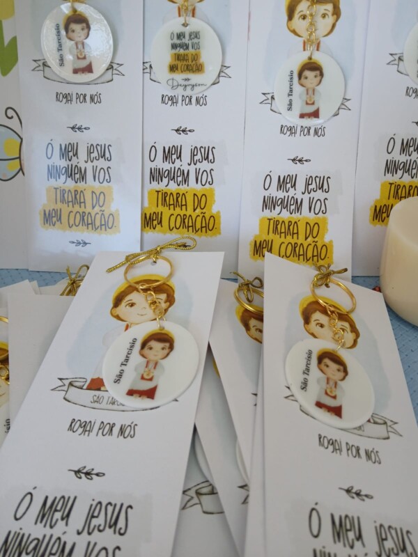 Card com chaveiro em acrílico para lembrancinhas de coroinha (São Tarcísio).